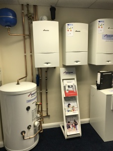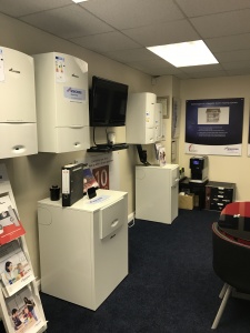 Boilers, cylinders and radiators on display.